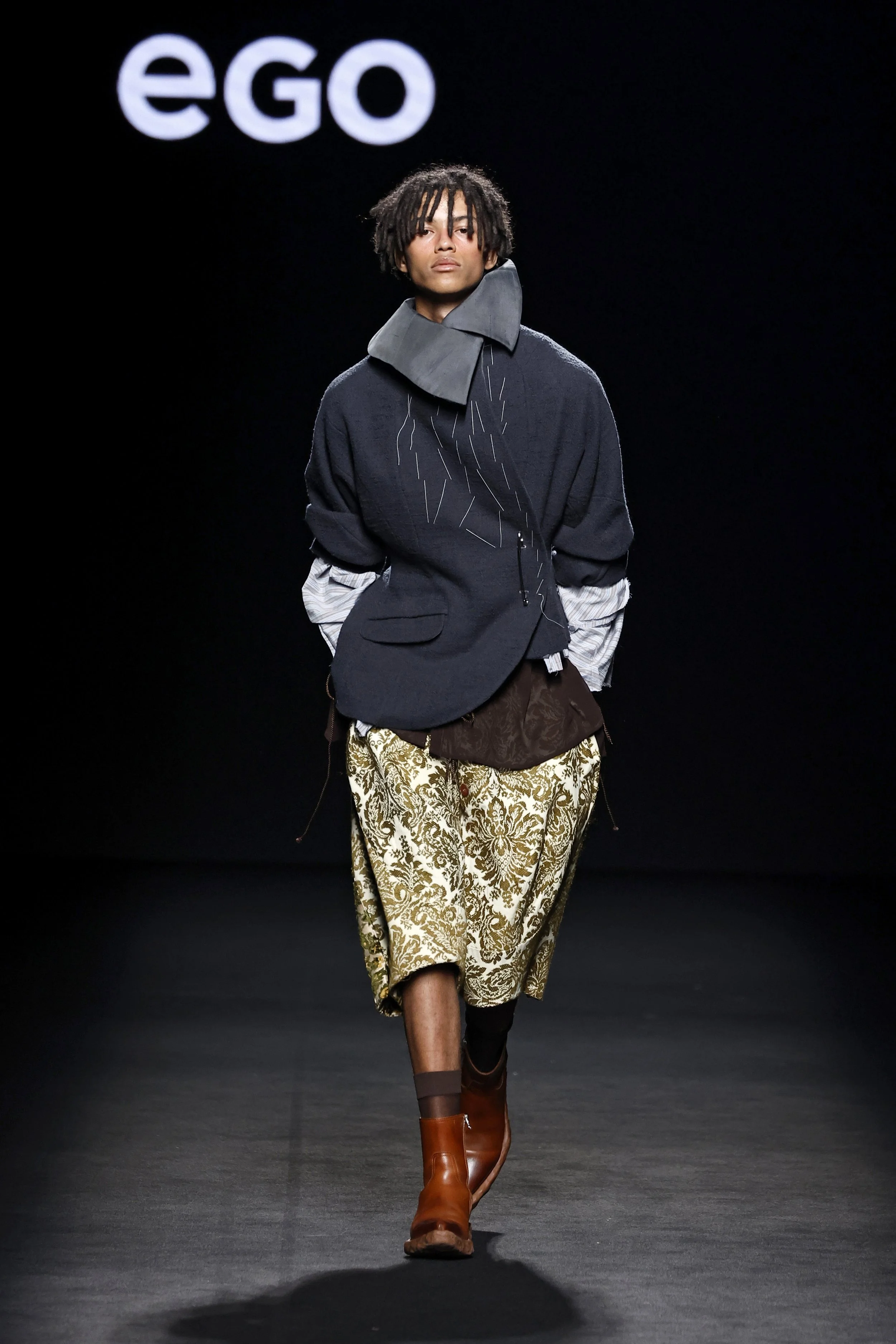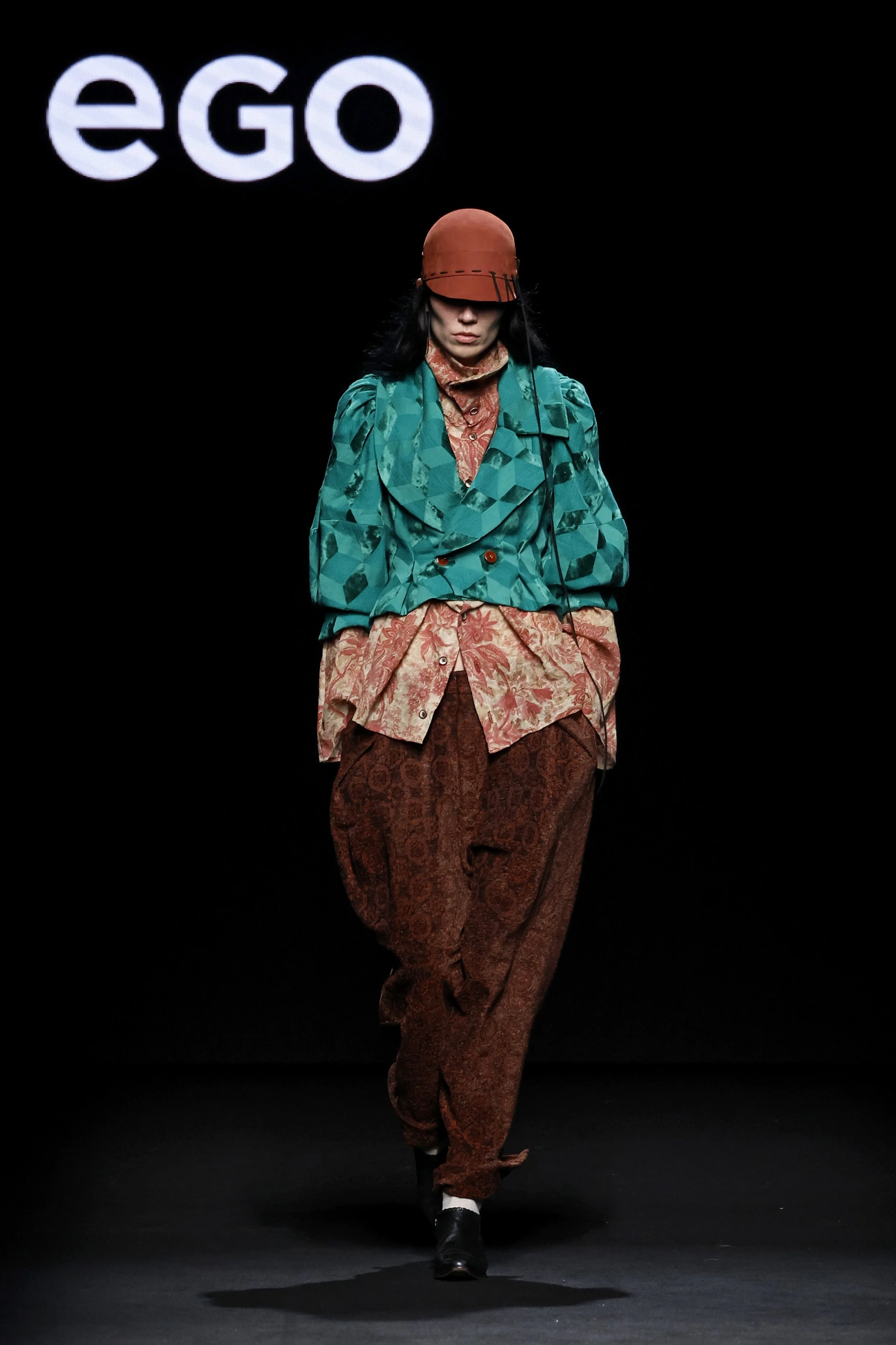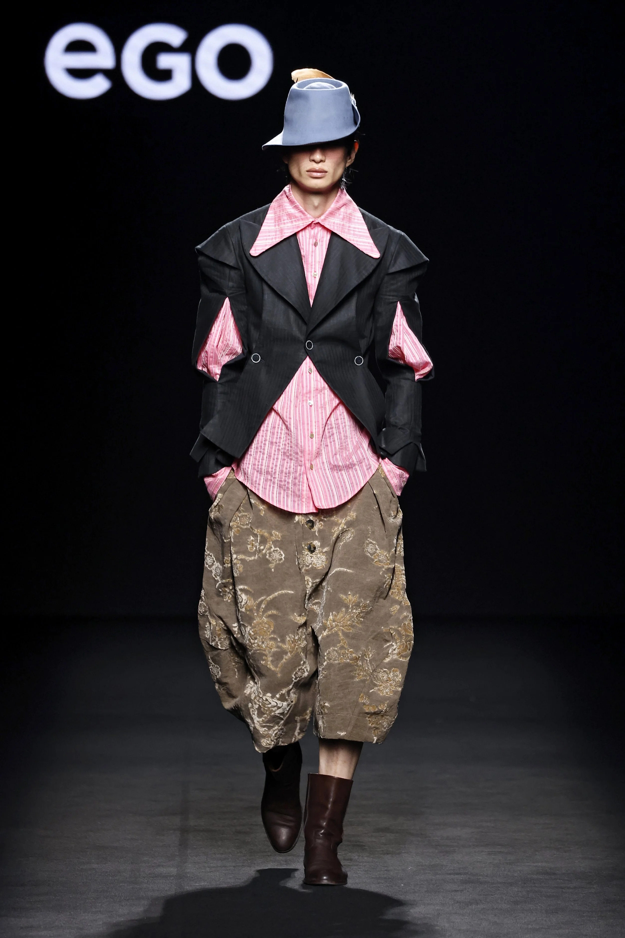 Voluminous sleeves, slashed details, ballooned trousers, and upholstery-inspired fabrics draw from early Baroque aesthetics, merging traditional tailoring with experimental pattern-making and styling.