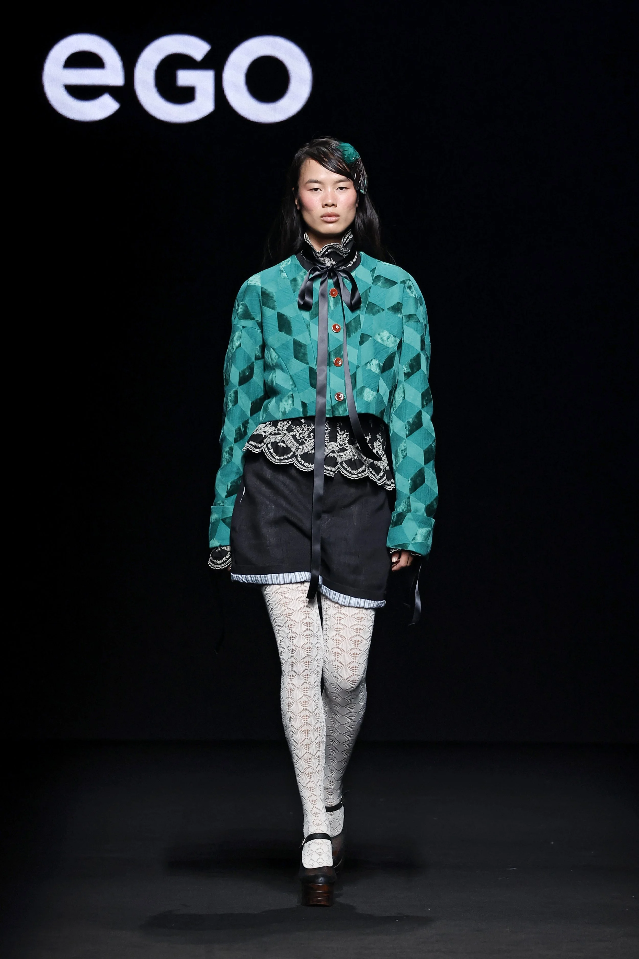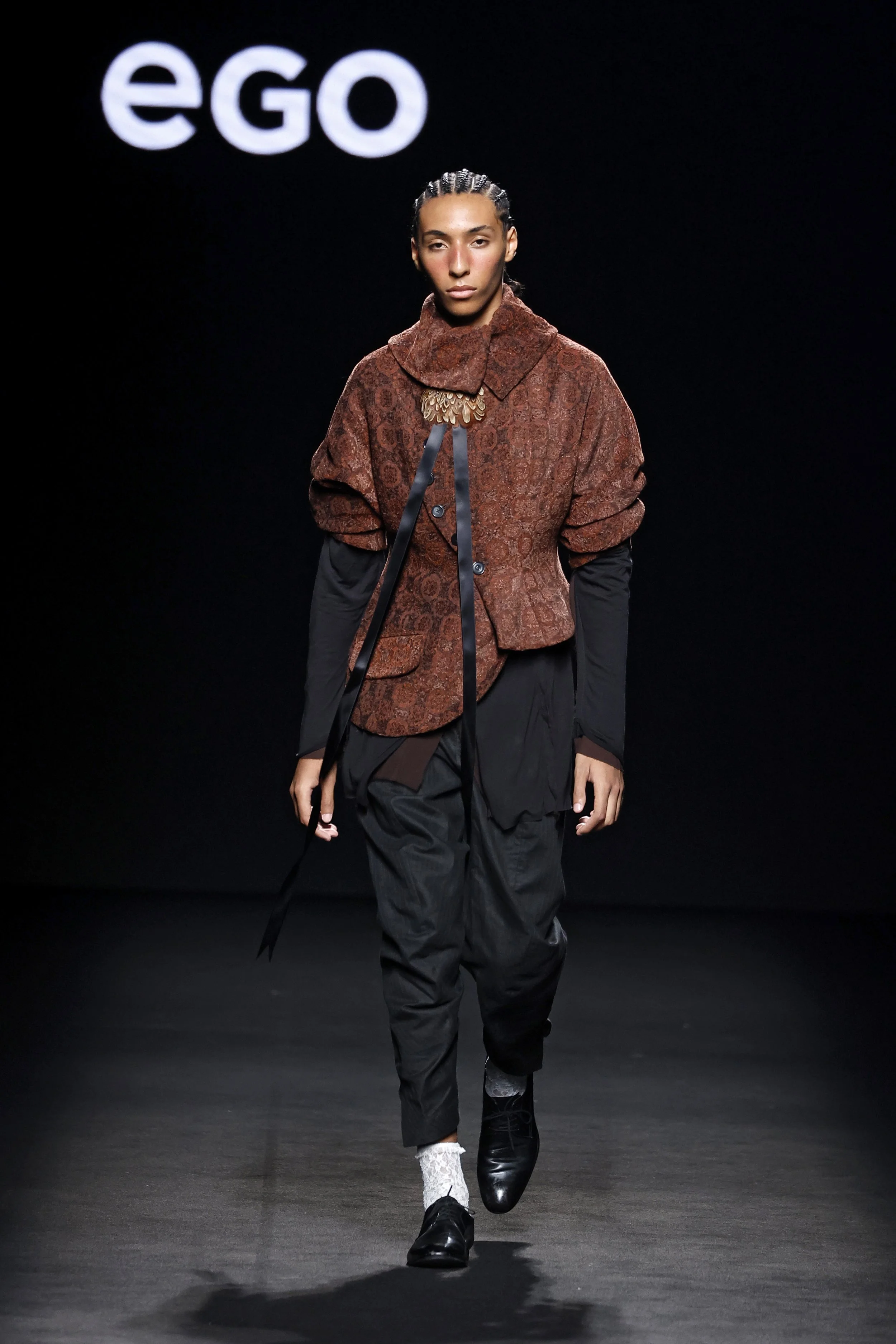Both stories share a shift from excess to sobriety, creating a tension between opposing forces. Like Orlando’s wardrobe, which playfully comments on identity and fashion’s dual nature, as both self-expression and constraint, the collection evolves from a decadent, volatile proposal into a distilled and monochromatic resolution.